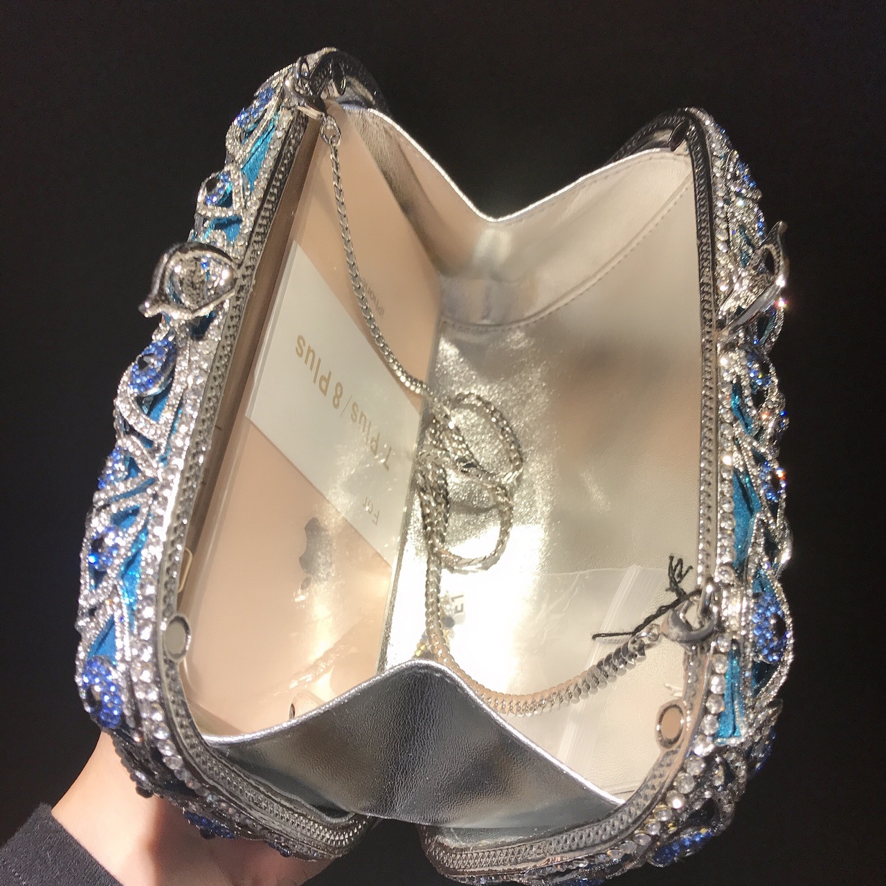 This crystal evening bag uses the highly mysterious “Evil Eye” motif as its core design element. We adopt high-density setting technique to meticulously arrange gradient crystals in shades of blue, clear and purple, creating a visually striking pattern. The clutch features a brilliant lake-blue base, symbolizing depth and protection, and is adorned with layers of encircling eye motifs.