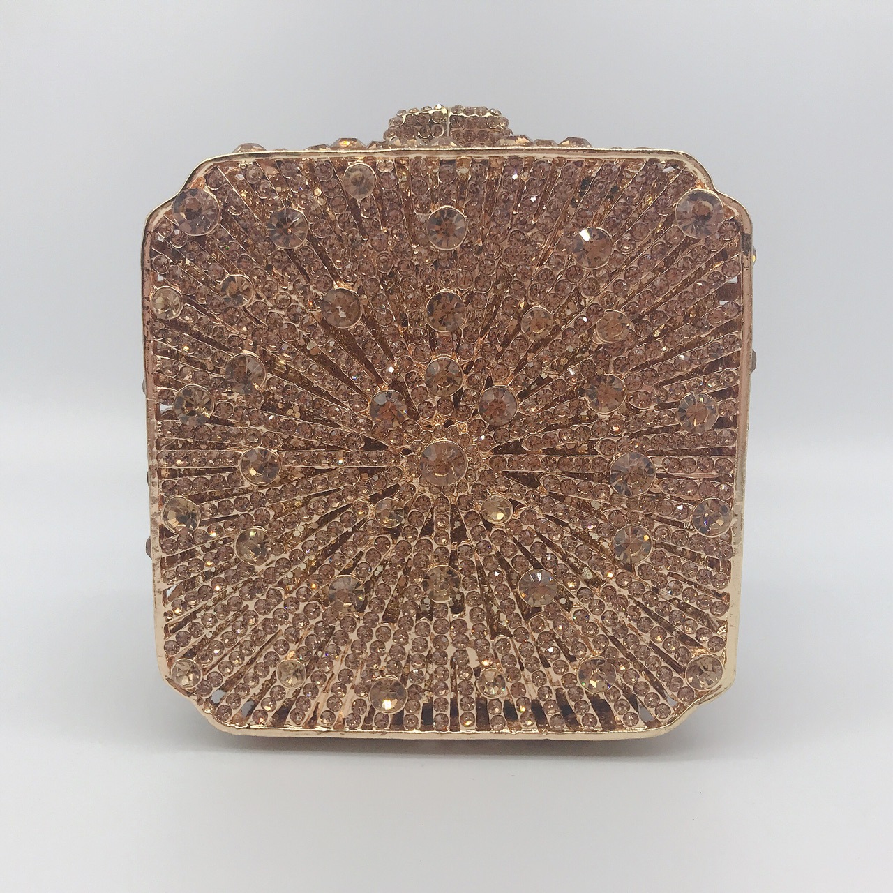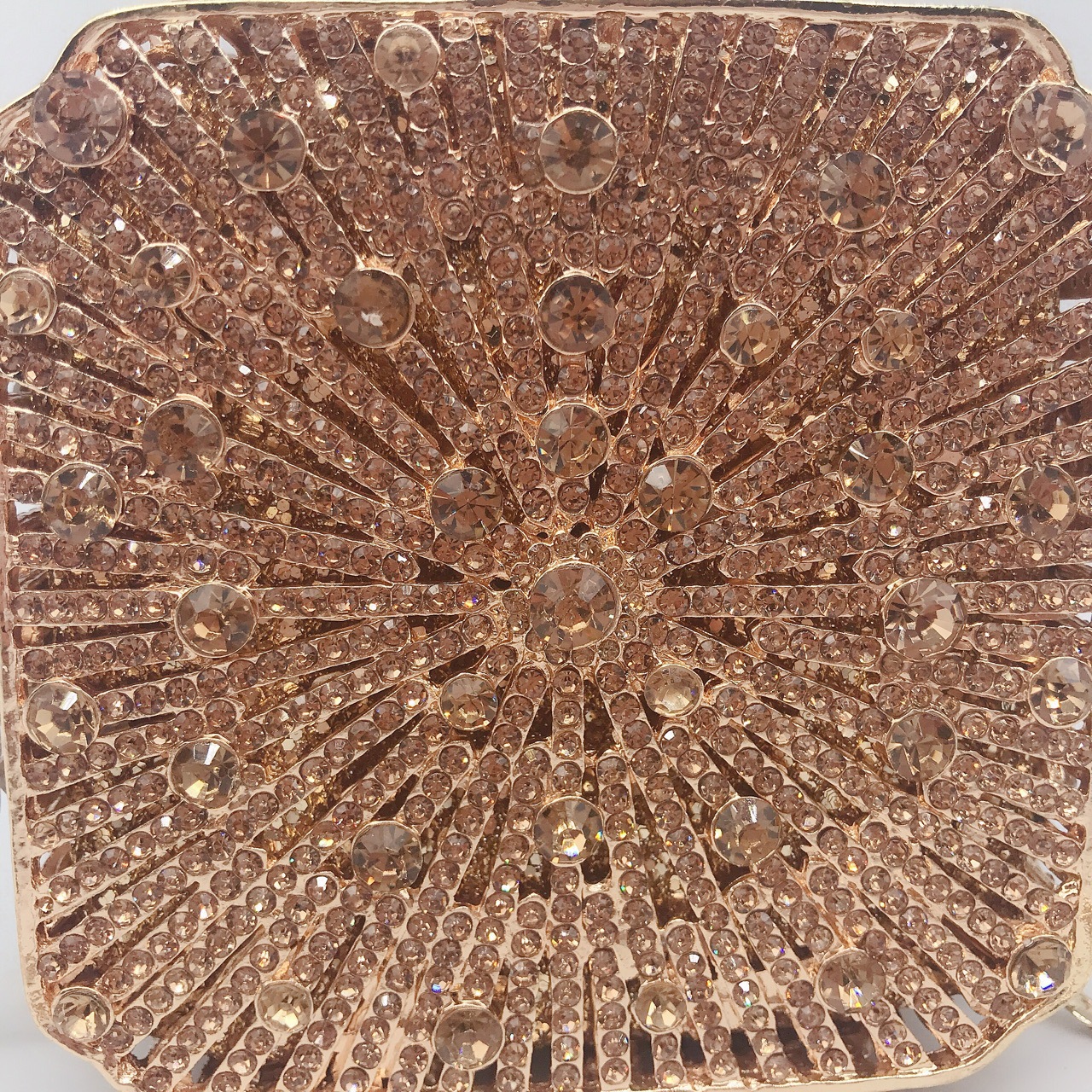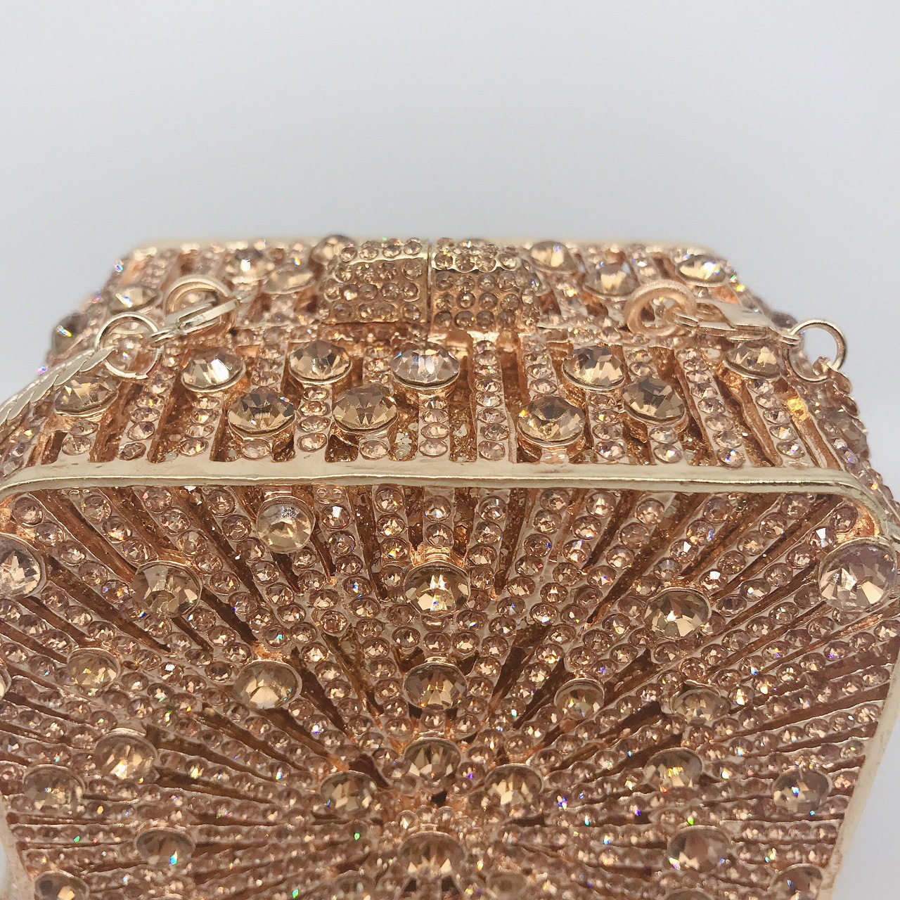 This crystal evening clutch features a striking radiant sunburst design, with fully hand-set high-shine clear crystals, we can also use AB crystals on this bag, please check the color options. On the bag, the crystals radiate naturally from its center, like starlight blossoming in the night sky. Round crystals of varying sizes are arranged in an artful scattering. Under the light, they create a rich sense of layered depth and fluid motion, making the entire bag feel alive even when static.