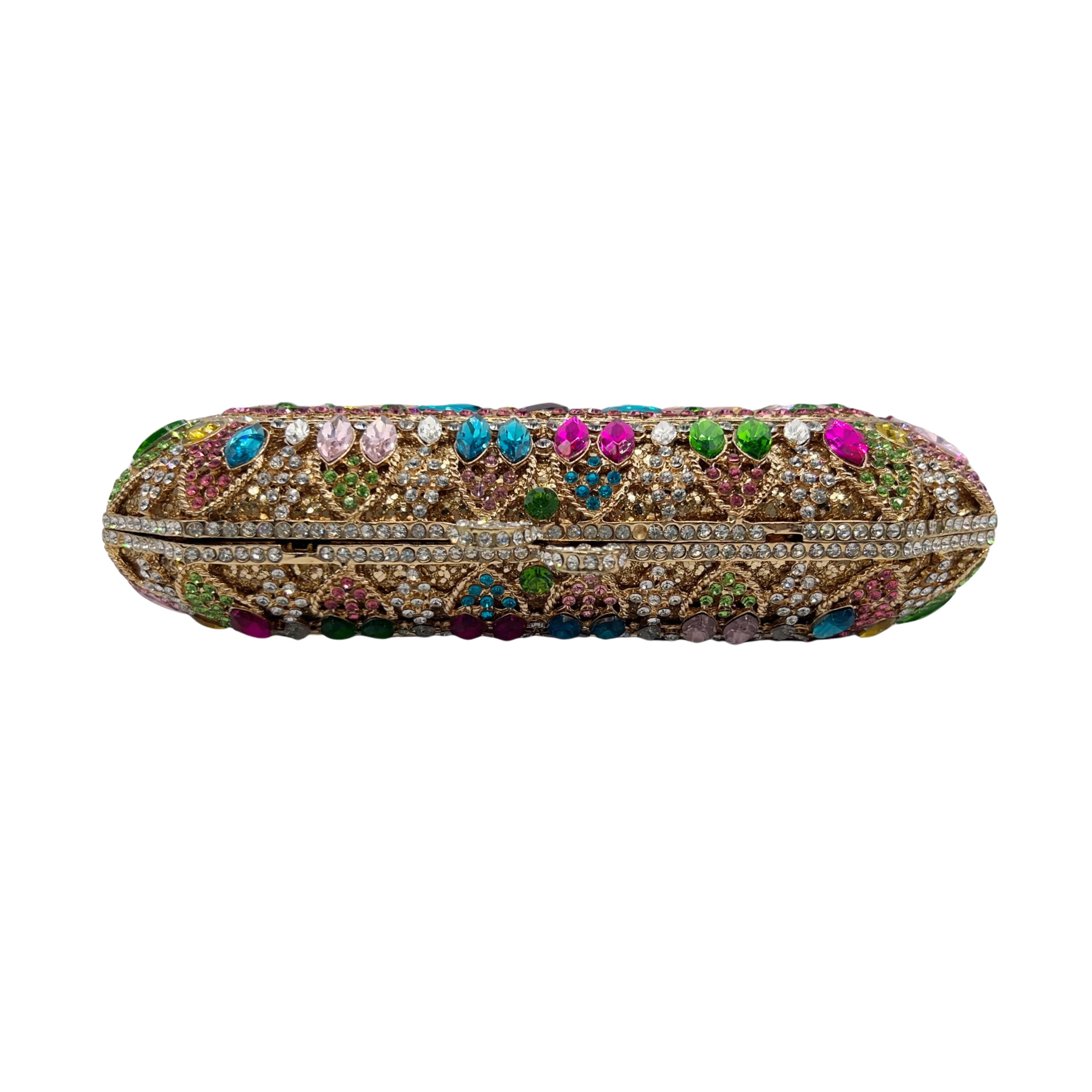 This multi-colored crystal evening bag is a show-stopping statement piece designed for high-wattage moments. It casts a kaleidoscopic sparkle under the light, dazzling with every movement. The symmetrical gemstone layout creates a luxurious jewel-box effect, instantly transforming your outfit into a statement look.
